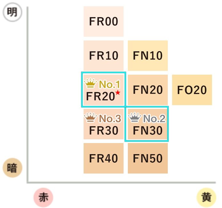 自然に見せたいならFN30、血色感を少し足したいならFR20を候補にすると、選びやすいです。